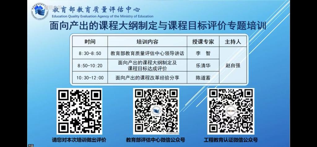 按照學校通知要求,為扎實推進我院工程教育專業(yè)認證工作,落實好教學課程大綱制定和課程目標評價,我院組織全院教師于8月4日上午通過騰訊會議在線參加教育部教育質(zhì)量評估中心召開的專題培訓。