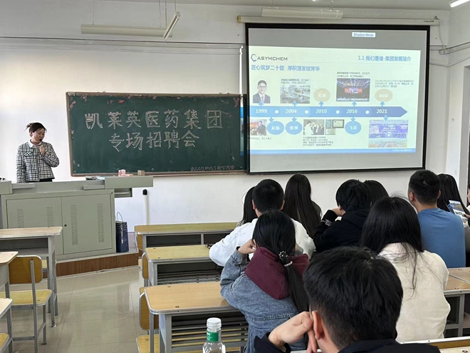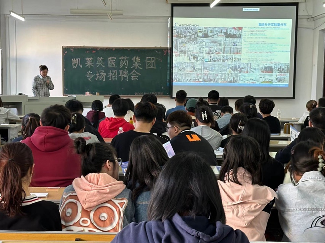 招聘會開始時,李陽首先介紹了集團,這讓我院學生了解到凱萊英醫(yī)藥集團是一家全球領先、技術驅動型的CDMO一站式綜合服務商。該集團為國內外的制藥公司、Biotech公司提供藥品全生命周期的一站式CMC服務、高效和高質量的研發(fā)與生產服務,加快創(chuàng)新藥的臨床研究與商業(yè)化應用。