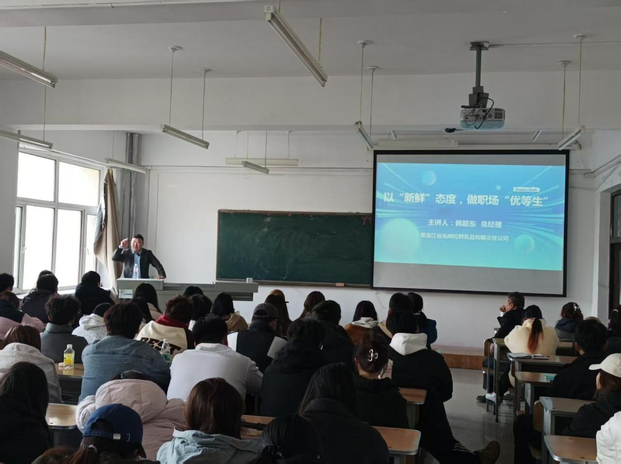 為幫助學(xué)生提前做好職業(yè)規(guī)劃,更好地了解職場(chǎng),進(jìn)一步提升學(xué)生職業(yè)競(jìng)爭(zhēng)力,明確職業(yè)發(fā)展方向,3月29日下午,學(xué)院邀請(qǐng)優(yōu)秀校友黑龍江省光明松鶴乳業(yè)有限公司總經(jīng)理韓超東先生回到母校,為學(xué)院師生帶來(lái)一場(chǎng)以“以新鮮態(tài)度,做職場(chǎng)優(yōu)等生”為主題的專題講座。講座在延德樓328教室舉行,學(xué)院院長(zhǎng)任健、黨委副書記曲鵬、食安系系主任焦巖、團(tuán)委書記、學(xué)工辦主任李海明以及2022級(jí)、2023級(jí)班級(jí)團(tuán)學(xué)骨干參加。